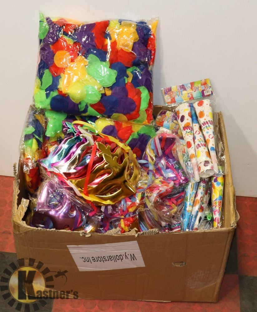 BOX OF ASSORTED PARTY ITEMS-MASKS AND MORE