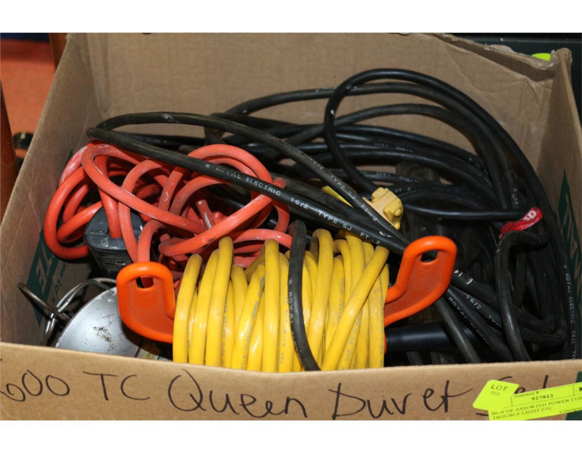 BOX OF ASSORTED POWER CORDS, TROUBLE LIGHT ETC