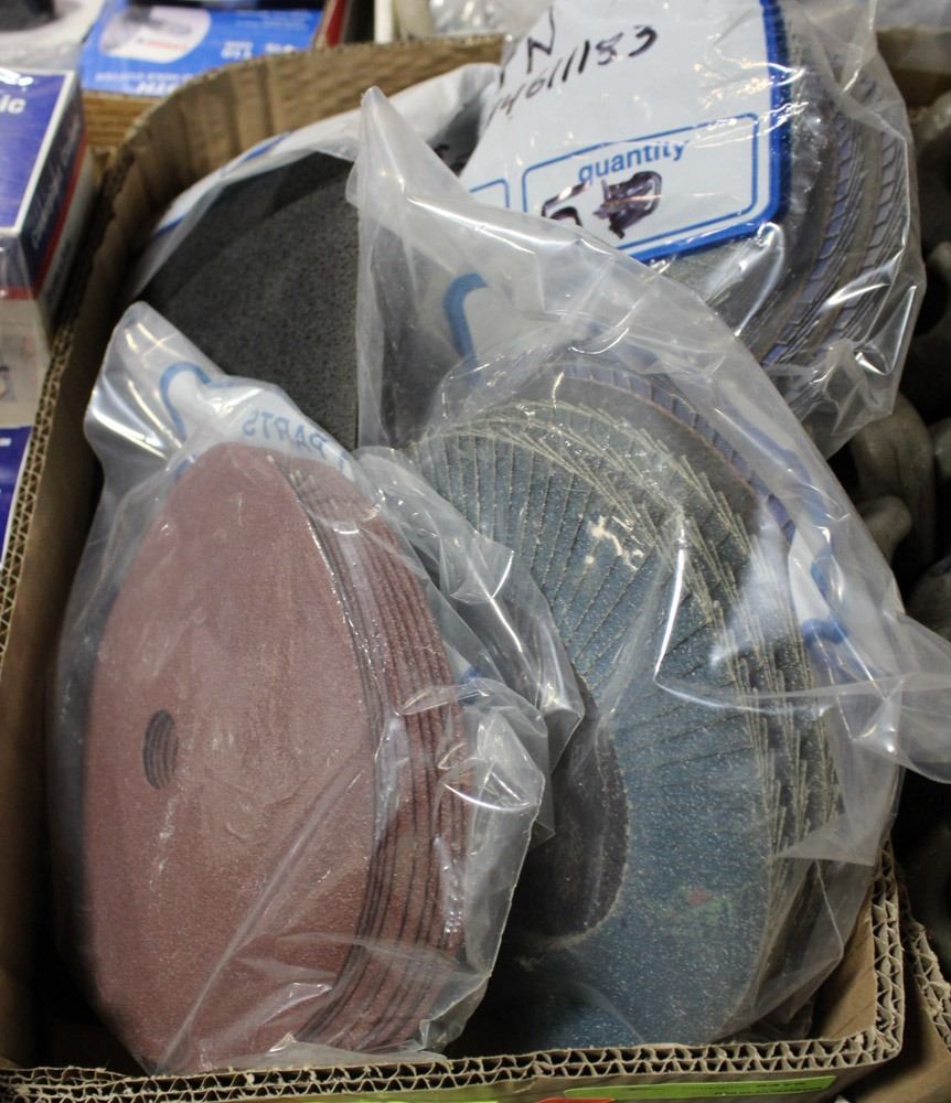 BOX OF ASSORTED SANDING DISCS, AND MORE