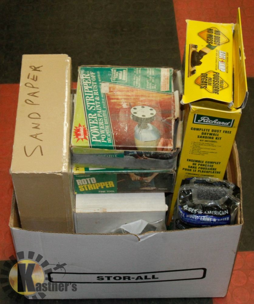 BOX OF ASSORTED SANDING PAPER AND EQUIPMENT