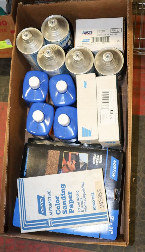 BOX OF ASSORTED SANDING PAPER, POLISH, AND MORE