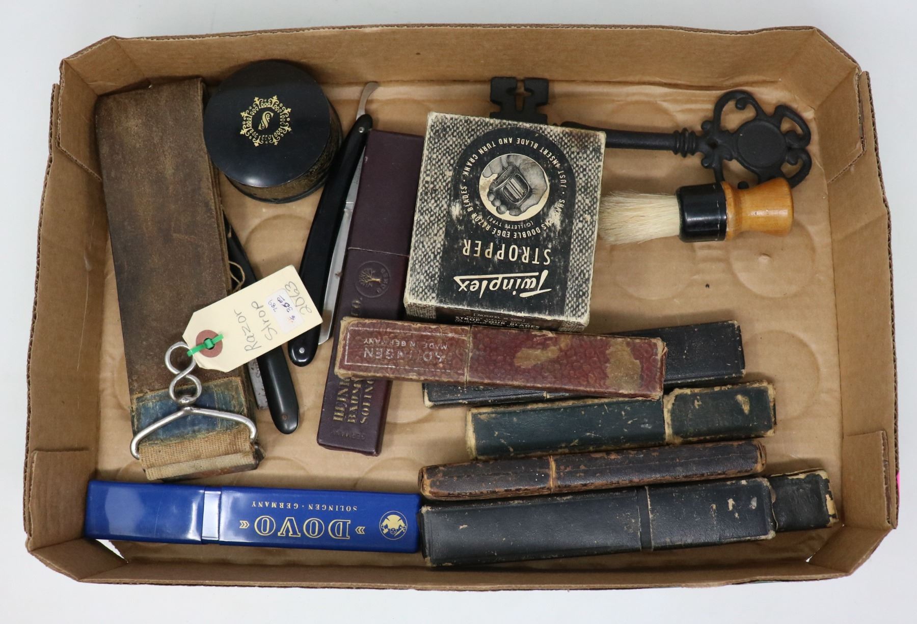 BOX OF ASSORTED SHAVING ACCESSORIES W 2 RAZORS