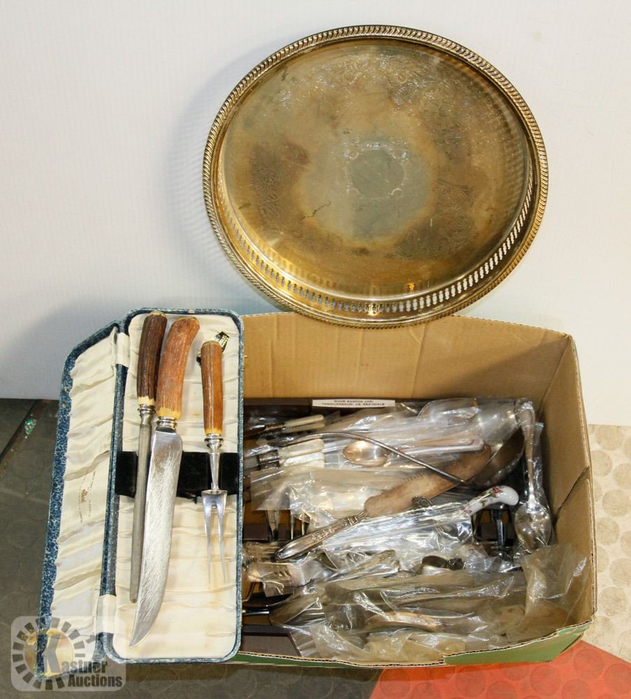 2 TRAYS ,INCL ROGERS BROS AND 3PC STAG HANDLED SET. COLLECTIBLES