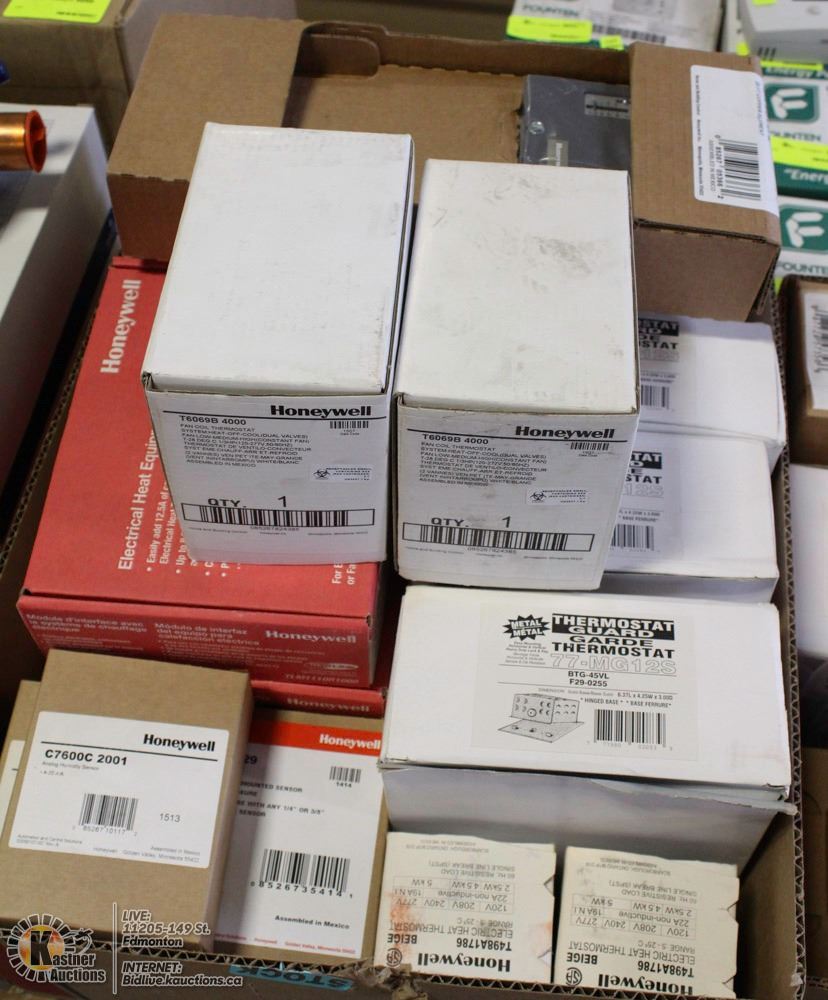 BOX OF ASSORTED THERMOSTATS, TEMP CONTROLLERS,