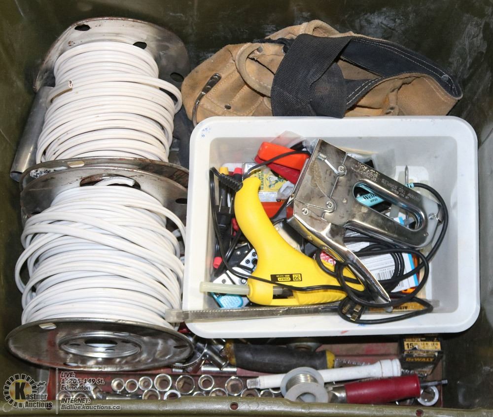 BOX OF ASSORTED TOOLS: ELECTRICAL WIRE, SOCKETS,