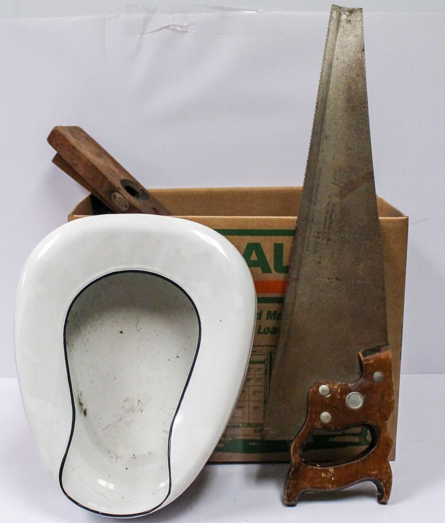 BOX OF ASSORTED VINTAGE TOOLS AND ENAMEL BED PAN