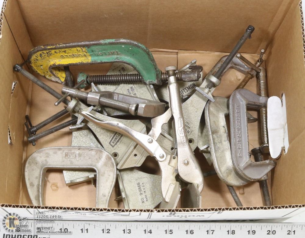 BOX OF ASSORTED WOOD WORKING CLAMPS AND PLIERS