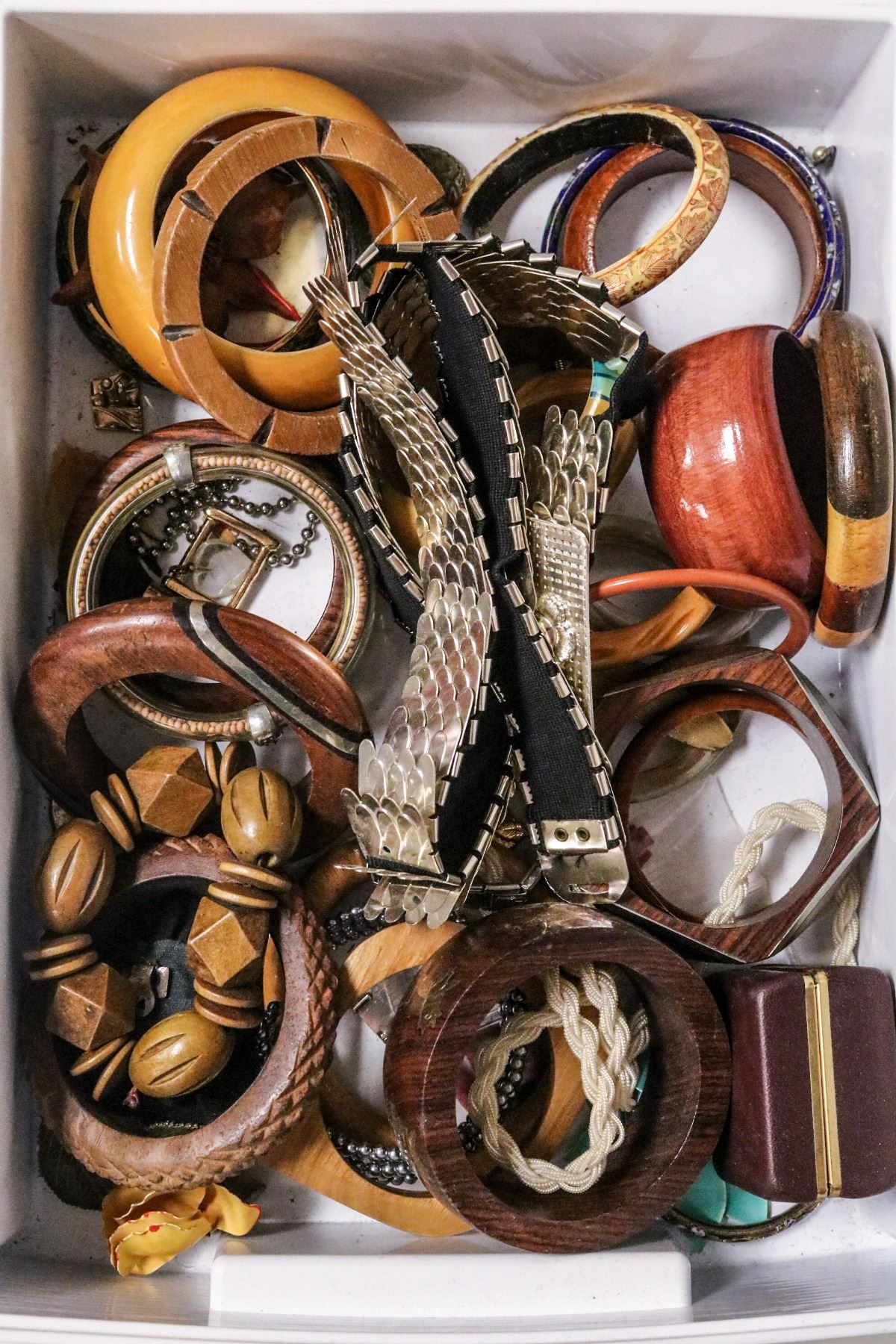 BOX OF ASSORTED WOODEN BRACELETS