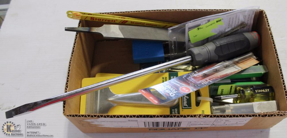 BOX OF ASST HAND TOOLS AND WINDOW SCRAPERS