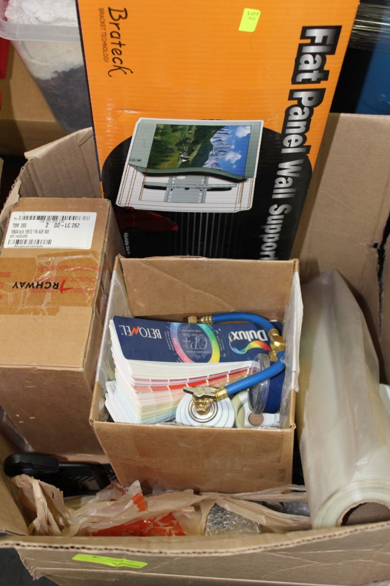BOX OF ASST. MISC AND FLAT PANEL WALL SUPPORT
