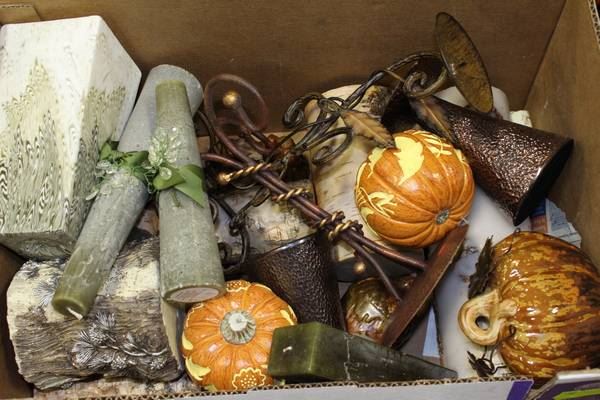 BOX OF ASST ORNAMENTS AND SCENTED CANDLES