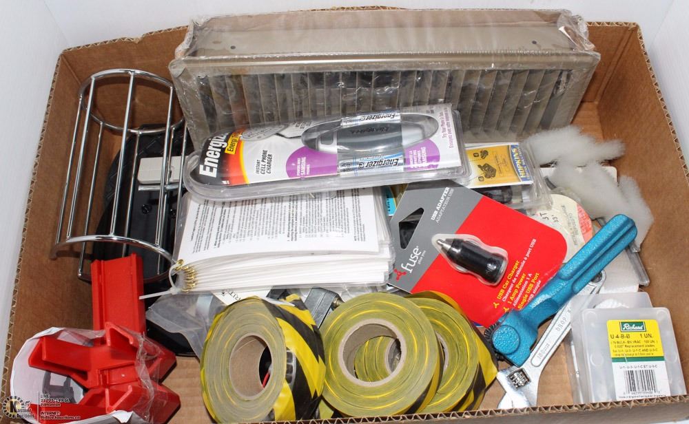 BOX OF ASST TOOLS/FLAGGING TAPE/BOX CUTTER BLADES