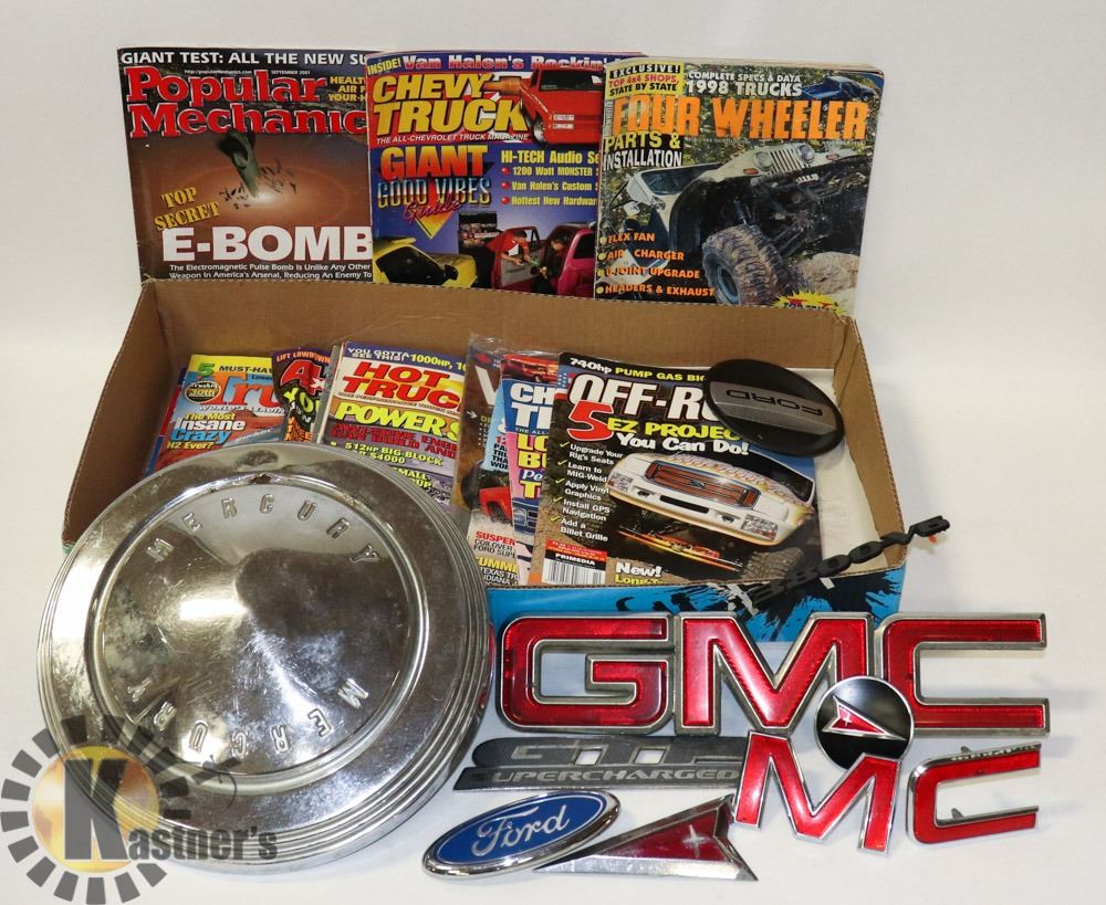 VINTAGE MERCURY CHROME HUBCAP, GMC, GTP & FORD BADGES, ETC. AND VINTAGE TRUCK MAGAZINES - COLLECTIBLES
