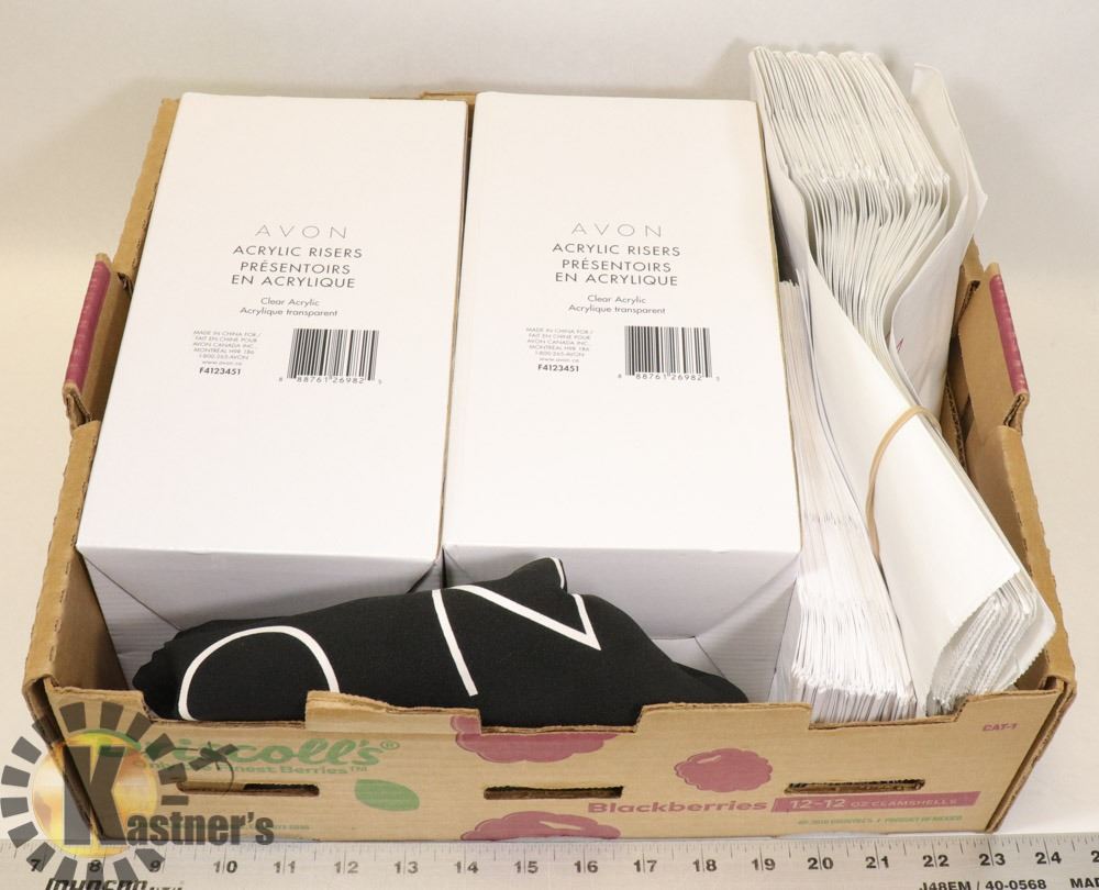 LARGE BLACK AVON TABLE CLOTH, 2 BOXES OF NEW DISPLAY STANDS AND VARIOUS SIZE BAGS