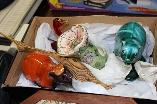 BOX OF BLUE MOUNTAIN POTTERY & MISC. ORNAMENTS