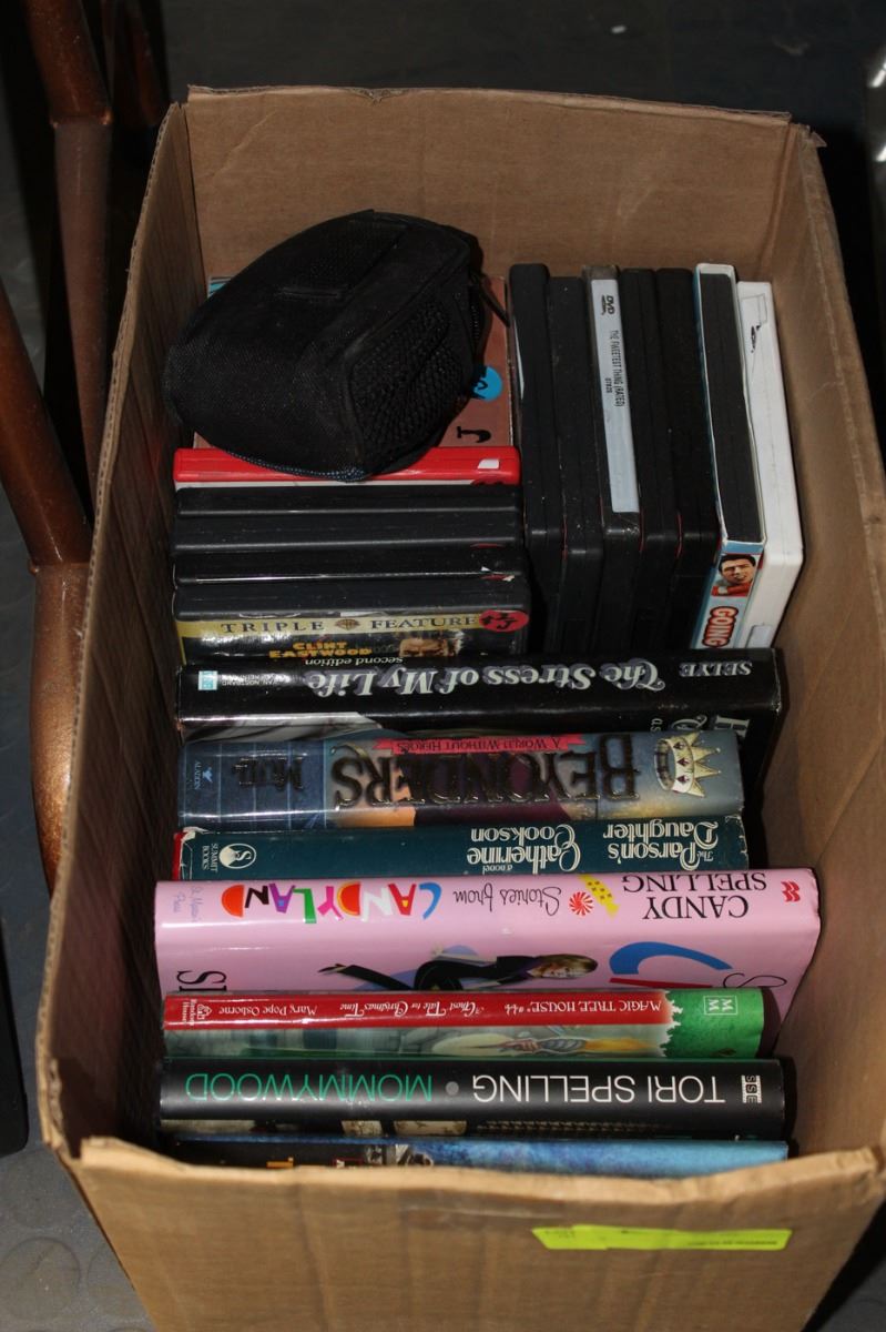 BOX OF BOOKS & DVD'S