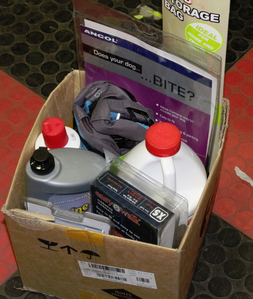 SOME OF THE ITEMS MAY INCLUDE HARNESSES, DOG CARRIERS,URINE OUT ,SHAMPOO AND SO MUCH MORE