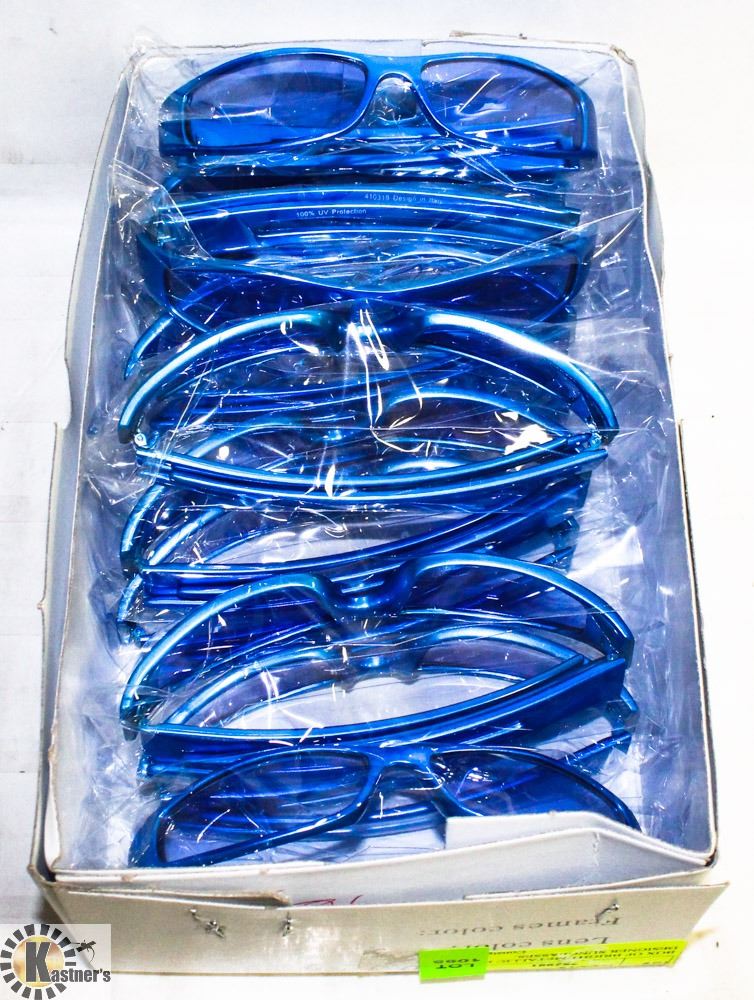 BOX OF BRIGHT METALLIC BLUE SUNGLASSES