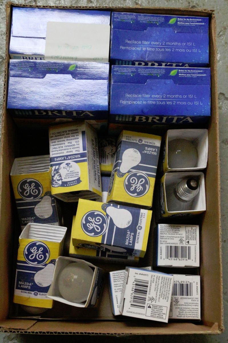 BOX OF BRITA WATER FILTERS AND LIGHT BULBS