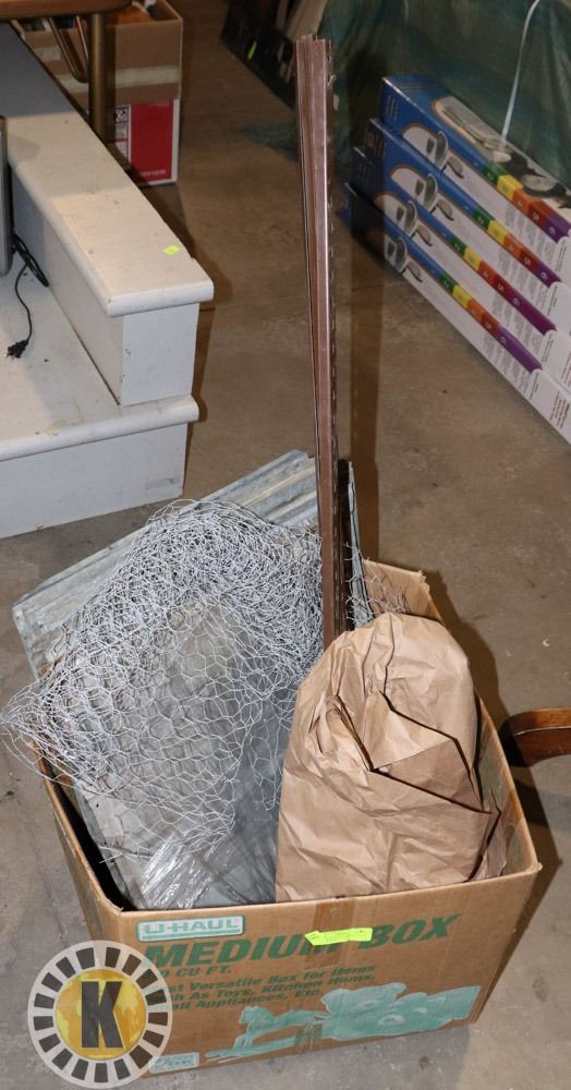 BOX OF BUILDING SUPPLIES- NETS, METAL SHEETS