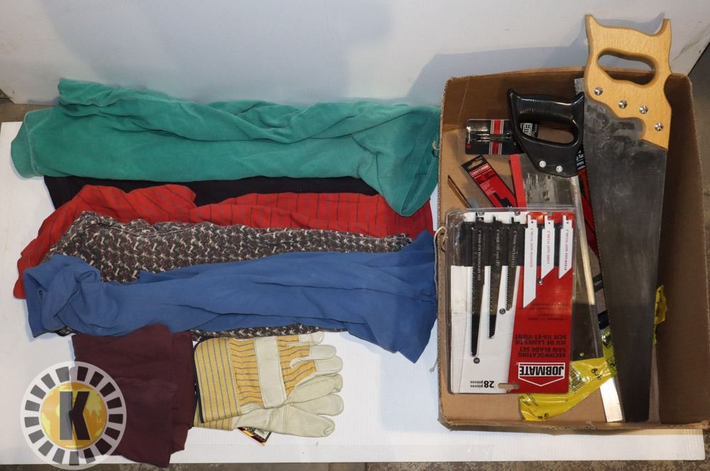BOX INCLUDES: SAWS, REPLACEMENT SAW BLADES , STUD FINDER, LINE LEVEL, SHIRTS FOR RAGS***ITEM(S) LOCATED IN LETHBRIDGE ALBERTA