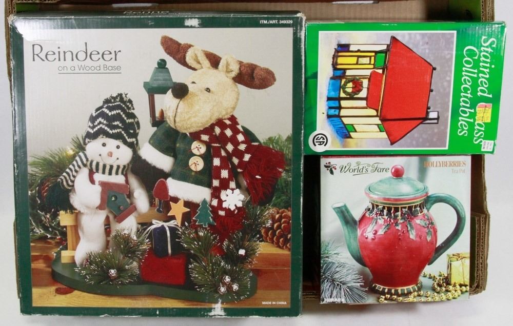 LARGE SNOWMAN DECORATION IN ORIGINAL BOX ON WOODEN BASE, STAINED GLASS HOUSE IN ORIGINAL BOX, CHRISTMAS TEAPOT IN ORIGINAL BOX