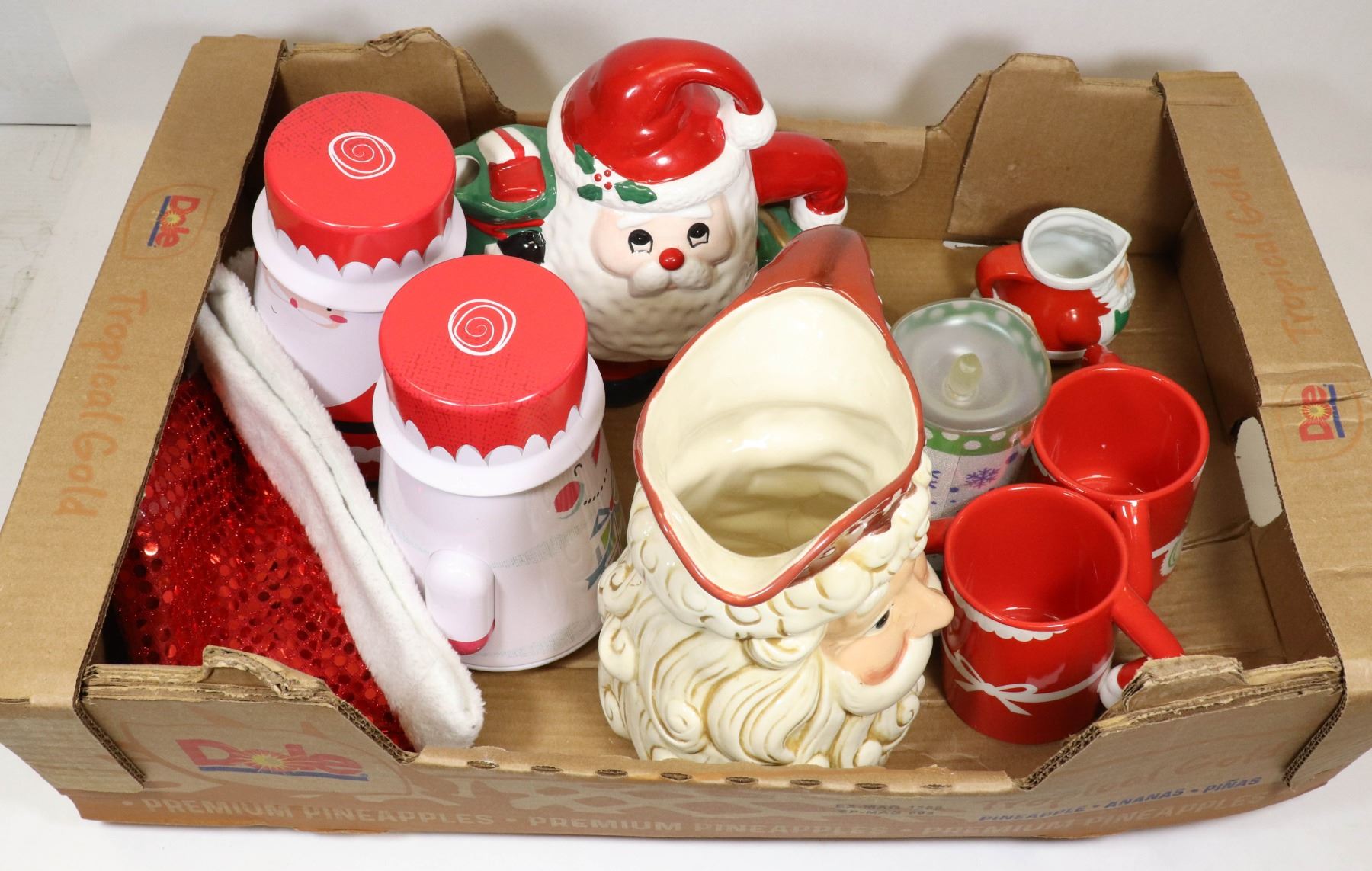 2 ROLLY POLLY CHRISTMAS TINS, 2 MRS CLAUS 10 OZ MUGS, BATTERY OPERATED CANDLE AND A SNOWMAN COASTER SET IN A TIN, LARGE SANTA TEAPOT WITH MR AND MRS CLAUS CREAMER AND SUGAR SET, LARGE SANTA EGG NOG PITCHER 8.5 INCHES TALL. SEASONAL