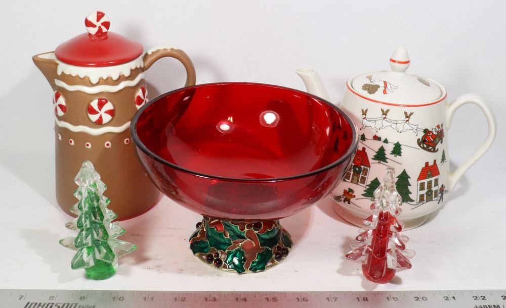 ONE CHRISTMAS SCENE TEAPOT, ONE GINGERBREAD TEAPOT ONE CRANBERRY GLASS WITH METAL HOLLY BASE COMPOTE, PAIR OF ART GLASS CHRISTMAS TREES