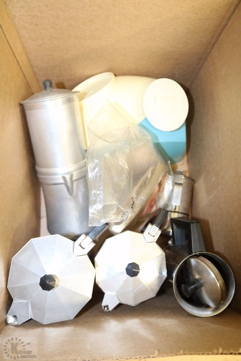 BOX OF COFFEE PERCULATORS, SCALE, ETC.