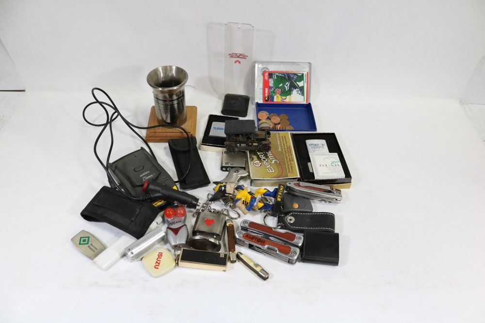 BOX OF COLLECTABLE LOTS OF POCKET KNIVES, ZIPPOS.