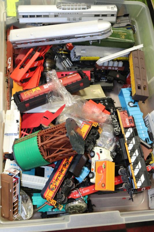 BOX OF COLLECTIBLE HO SCALE TRAINS AND CARS