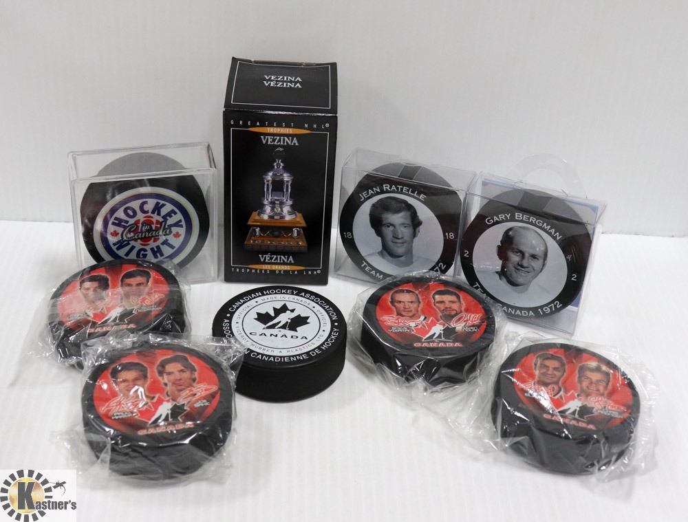 BOX OF COLLECTOR HOCKEY PUCKS AND MINI TROPHIES
