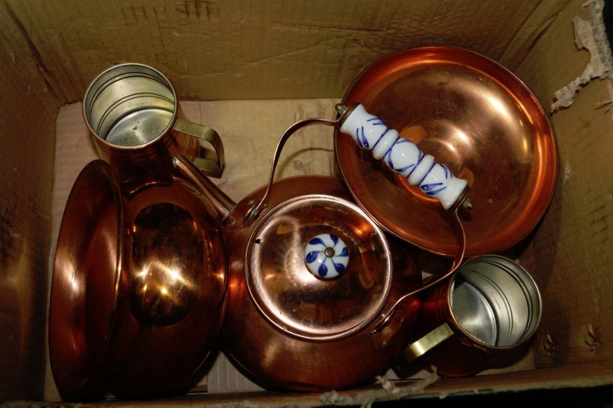 BOX OF COPPER COFFEE POT,TANKARDS CANDYDISH & BOWL