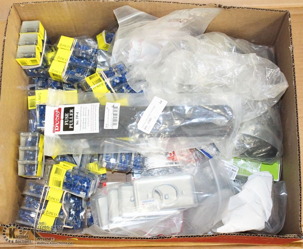 BOX OF ELECTRICAL CONNECTORS, FUSE PULLERS & MORE