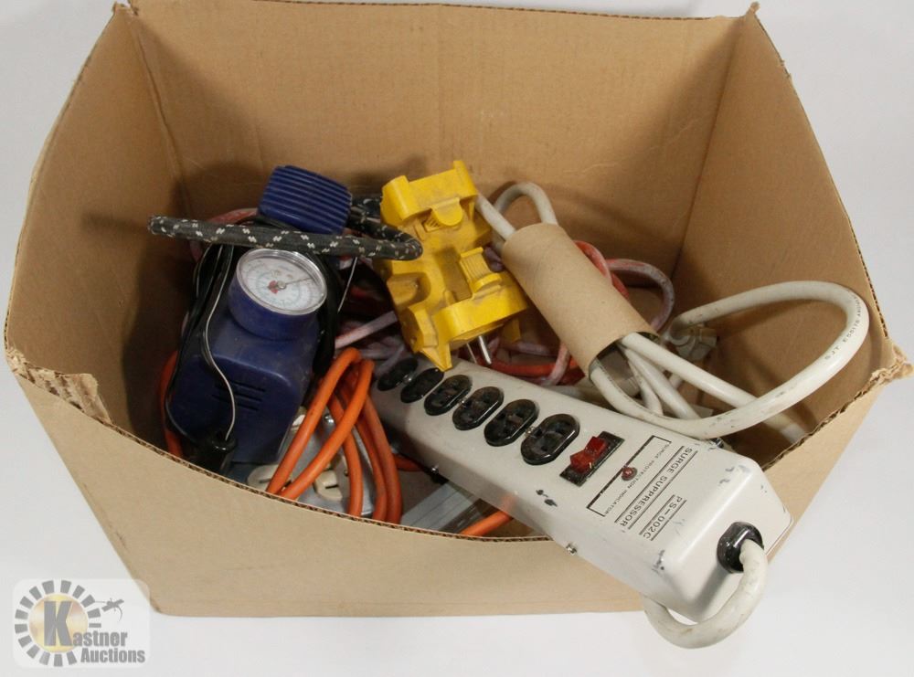 BOX OF ELECTRICAL CORDS, POWER BARS AND MORE
