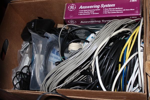 BOX OF ELECTRONICS AND CABLES/CHARGERS