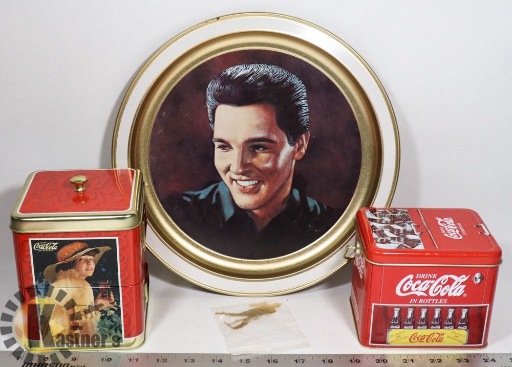 COCA-COLA TINS, BRASS ELVIS PENDANT AND LARGE METAL ELVIS PLATTER