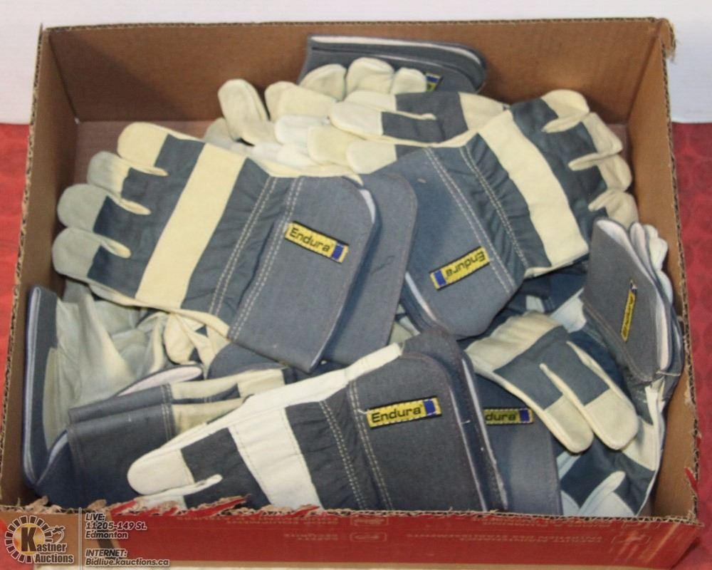 BOX OF ENDURA LEATHER WORK GLOVES.