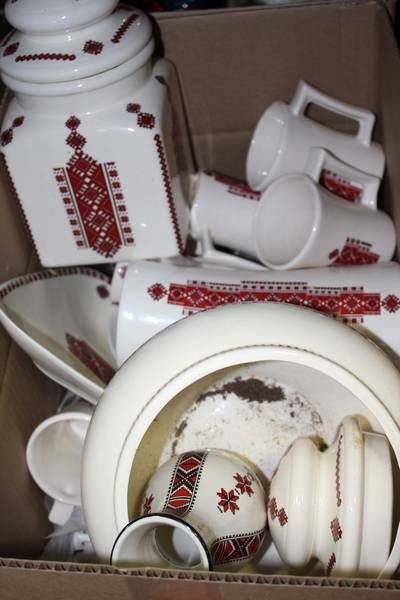 BOX OF ESTATE CERAMIC UKRANIAN DISHES