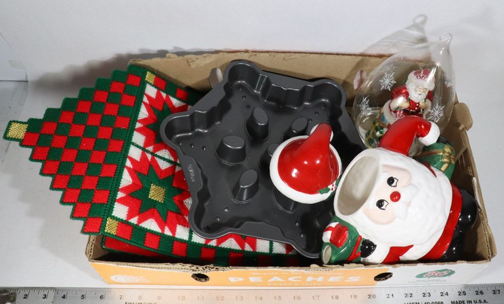 LARGE SANTA TEAPOT, CHRISTMAS TABLE RUNNER, WILSON SNOWFLAKE CAKE PAN, LARGE CLEAR GLOBE WITH SANTA DISPLAY INSIDE