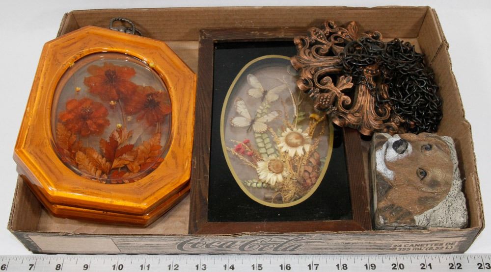 APAIR OF FLORAL WALL PLAQUES, BUTTERFLY SHADOWNBOX, DOG CANDLE AND COPPERCRAFT CHAIN WALL DECORATION