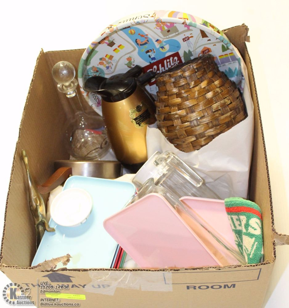 BOX OF ESTATE KITCHEN WARE, SERVERS AND MORE