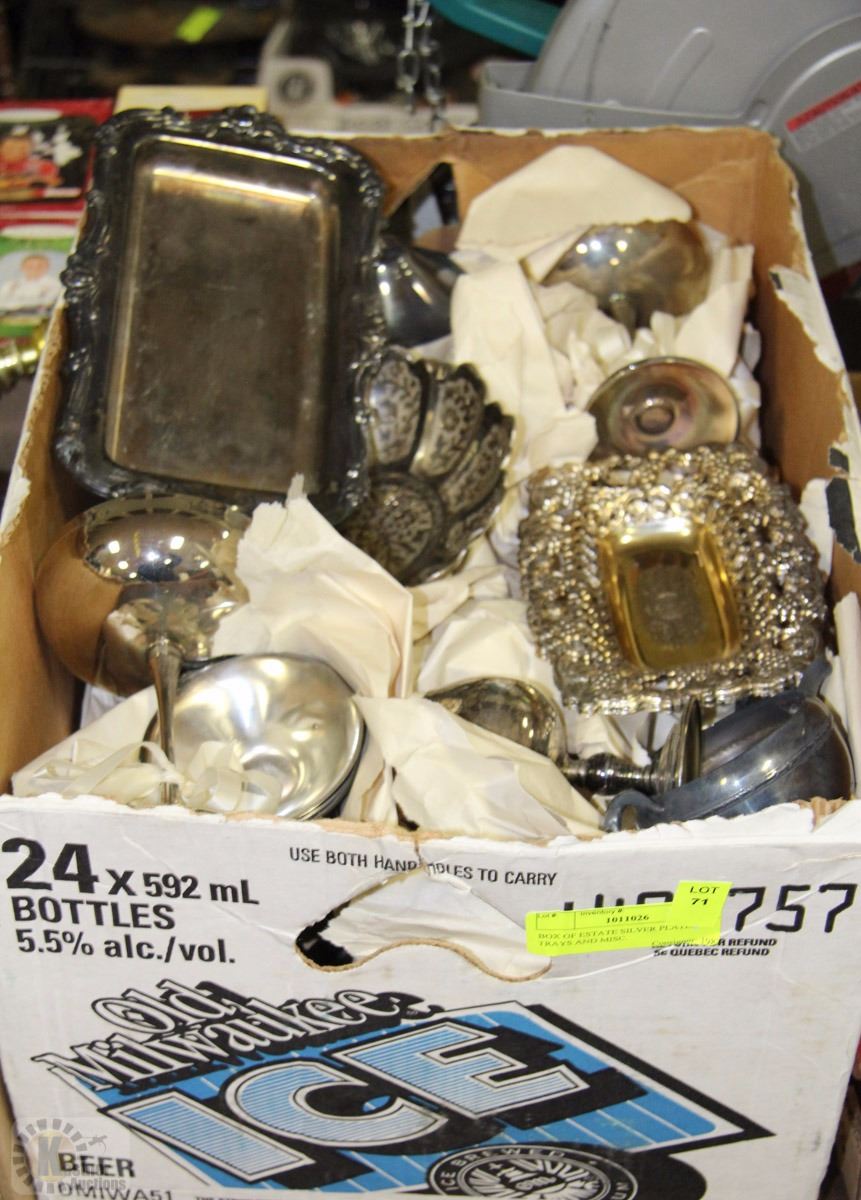 BOX OF ESTATE SILVER PLATED TRAYS AND MISC.