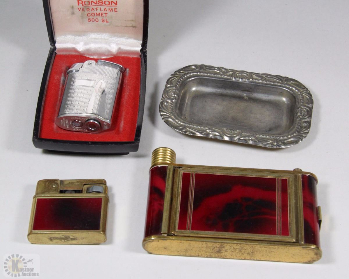 BOX OF ESTATE VINTAGE LIGHTERS AND MINI TRAY