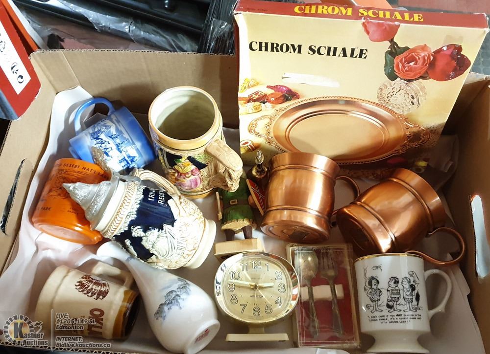 INCL. FINE CHINA, WESTERN GERMANY STEIN, BRASS BELL, VINTAGE SILVER PLATE FORK/SPOON SET, VINTAGE WIND UP CLOCK, VINTAGE CUPS, WOOD CARVED KNIGHT FIGURINE, COPPER CUP SET, ETC. - COLLECTIBLES