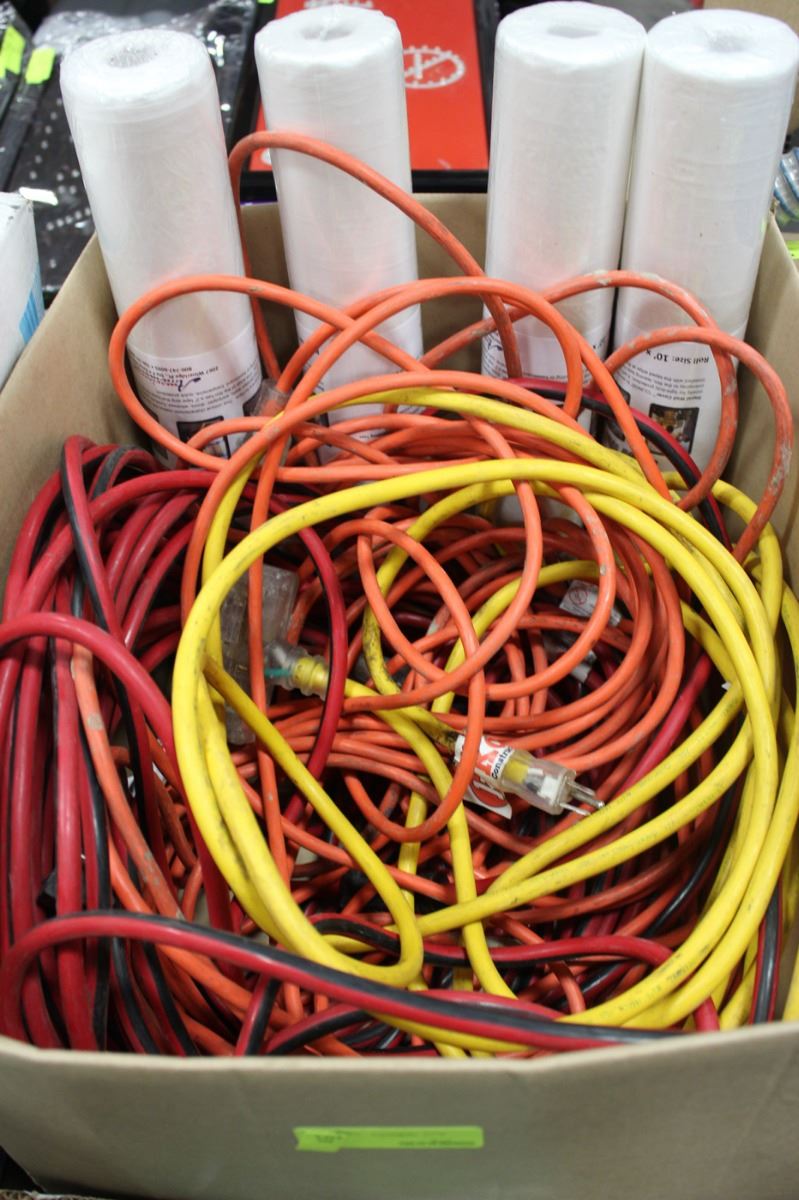BOX OF EXTENSION CORDS AND RAPID WALL COVER