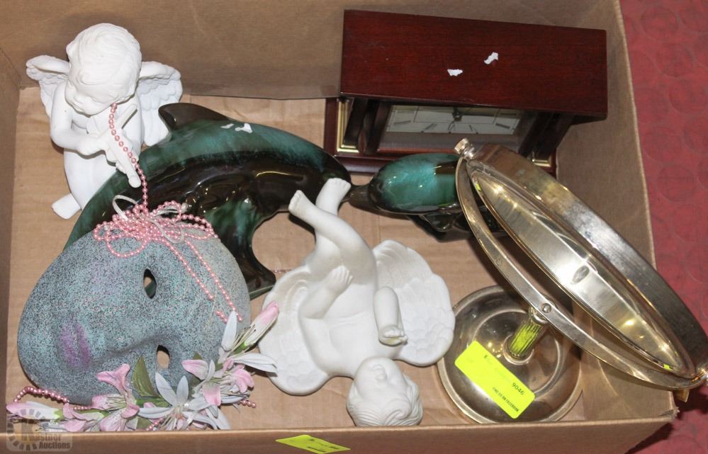 BOX OF FIGURINES, MASK, CLOCK, AND MIRROR