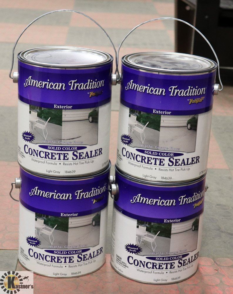 BOX OF FOUR 1 GAL CANS OF CONCRETE STAIN. GREY.