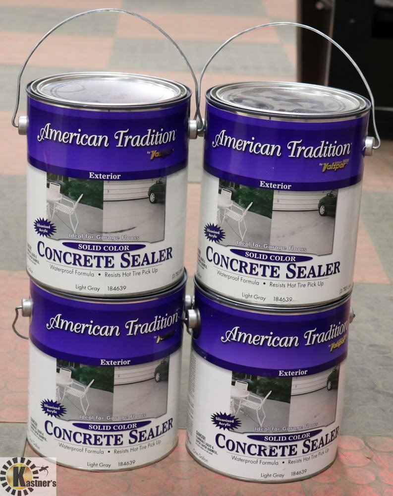 BOX OF FOUR 1 GAL CANS OF CONCRETE STAIN. GREY.