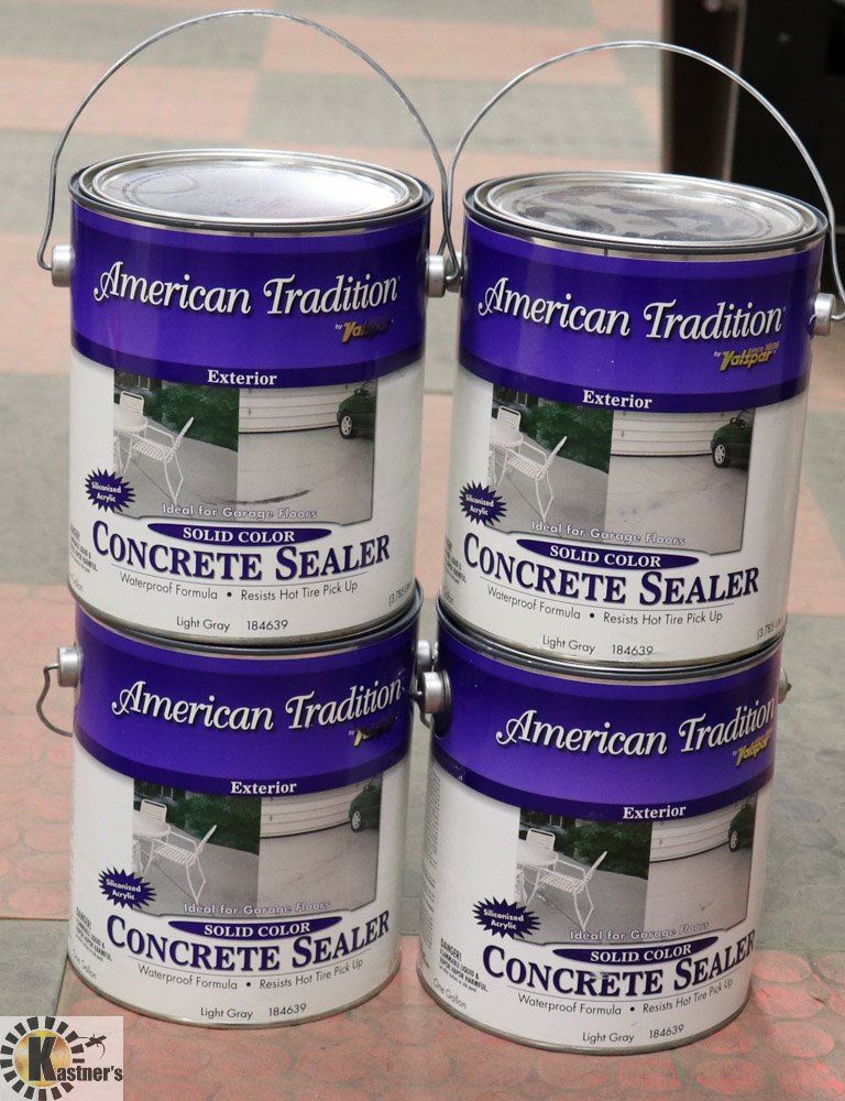 BOX OF FOUR 1 GAL CANS OF CONCRETE STAIN. GREY.